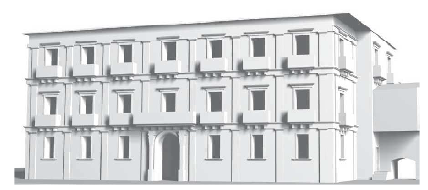 In Figura: prospetto ovest di Palazzo Ricciulli (foto e rendering da modello 3D)
