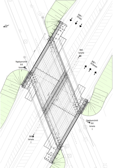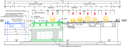 The existing bridge is an approximately 31-metre-long and 42-metre-wide, single-span concrete bridge, consisting of four partial structures, of which two inner sections were built in 1956 and widened on both sides in 1980. In particular, the inner partial structures are no longer able to cope with the high traffic load. The new bridge structure (see Fig. 1) will be rebuilt in the same position as the existing structure. The challenge of this construction project is to maintain traffic on the highway with as little disruption as possible during the construction of the new bridge. For this reason, the bridge is being reconstructed in several sections (see Fig. 2) in a confined space and with complex construction site logistics. Another challenge is the short construction period that was planned for the replacement of the bridge.