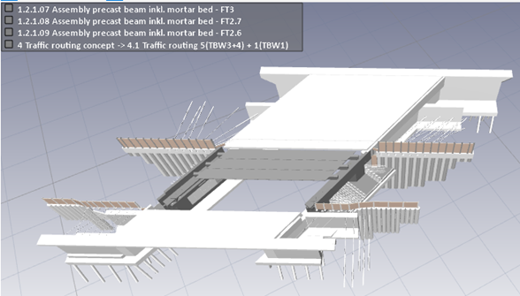 After reworking the information models of the pilot project (models of the existing bridge, new bridge, pit shoring, drainage pipes, etc.) in Revit and connecting the model elements with a previ-ously project-specific developed Work Breakdown Structure, the models are exemplary used for several functions in the software Bexel. Therefor Selection Sets and Custom Breakdown Struc-tures are created. Tools like 3D model coordination, property checking, 4D project scheduling and construction process animation via the zone editor (see Fig. 4), 5D cost data base with assign-ment of cost items to model elements, are presented.