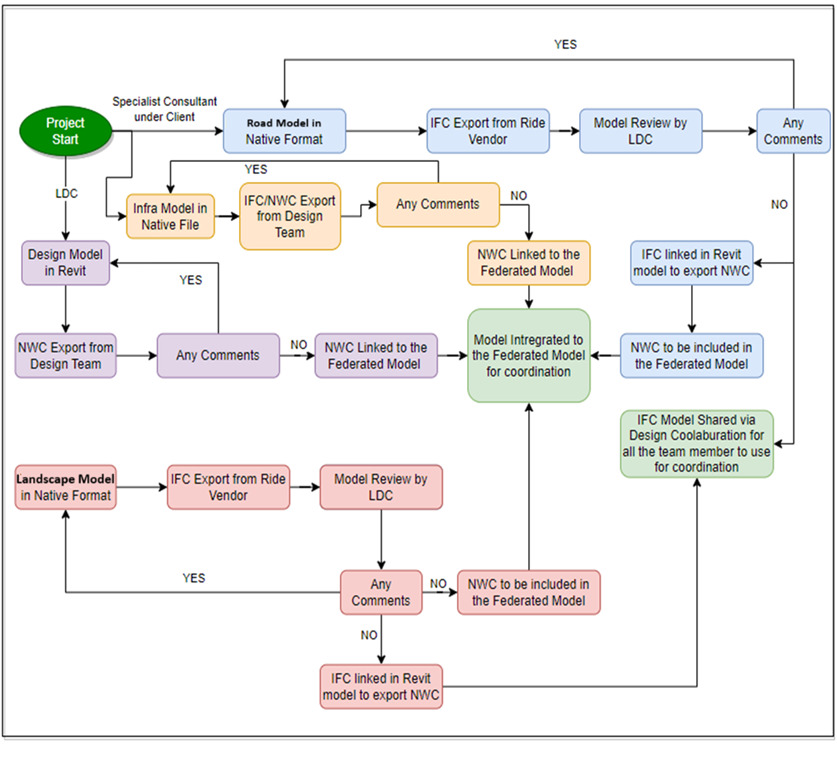 The project requirements delineate the specialized consultants’ responsibility in developing the model across various BIM environments, such as Autodesk Revit and Civil 3D, etc. Effective coordination and communication between the specialist and lead design consultants are essential to this process. The proposed workflow is specifically crafted to foster collaboration between consultants and the client, focusing on this master plan project involving diverse design consultants and specialists.