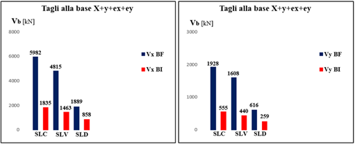 Figura 2: Confronto tra il taglio alla base della struttura a base fissa con quello della corrispondente struttura isolata alla base, considerando il sisma prevalente in direzione X ed il 30% di quello in direzione Y.