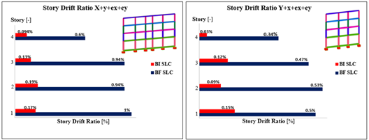 Figura 3: Confronto tra lo story drift ratio della struttura a base fissa con quello ottenuto nella corrispondente struttura isolata alla base allo SLC.