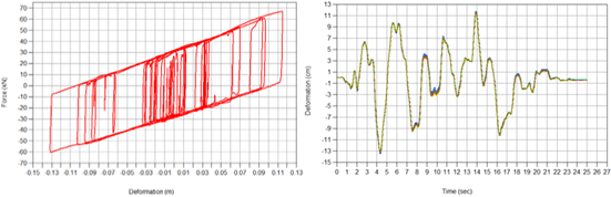 Figura 4: Ciclo forza – spostamento di uno dei dispositivi (sx) e sovrapposizione dell’andamento dello spostamento di ciascun dispositivo nel tempo (dx) ottenuti considerando il primo gruppo di storie temporali del moto del terreno allo SLC.