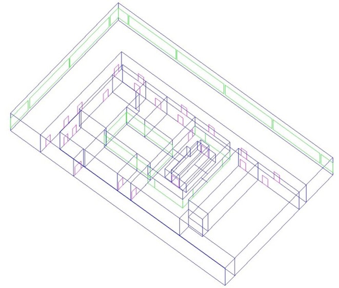 The first phase involved the construction of the model, including the building geometry, IT loads, thermo-physical properties of the spaces, and the configuration of the cooling system,  with particular attention to control logics and airflow regulation.