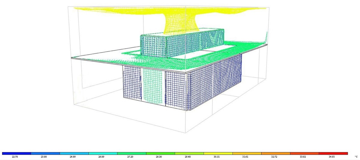 Through iterative refinements and careful thermal zone mapping, the model was progressively optimized to reduce discrepancies with observed behaviour. Corrections addressed cooling activation thresholds, fan modulation curves, and the thermal interaction between adjacent areas such as the supply air plenum and the server room, or between racks and the hot aisle. To support the design assumptions, a Computational Fluid Dynamics (CFD) simulation using the MicroFlo module was also conducted, validating airflow separation and identifying potential hotspots within the thermal distribution.