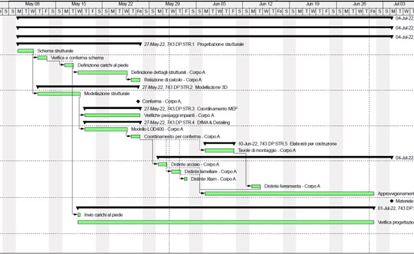 This new process underwent a detailed analysis of its effectiveness and operation using Earned Value analysis to obtain a more complete and conscious view of project performance, contributing to preventing potential issues and ensuring more effective resource and time management. Periodic assessment of indicators allows the detection of trends and patterns, facilitating timely correction of any deviations from the original plan. Furthermore, possibilities for improvement were explored through the implementation of Resource Leveling. Specifically, for the case study in question, a scenario was hypothesized in which the design starts later than anticipated (two weeks), and consequently, activities are shortened to maintain the fixed completion date. By doing so, the initially lost time could be recovered at the expense of increased costs, which would need to be agreed upon with the client.
