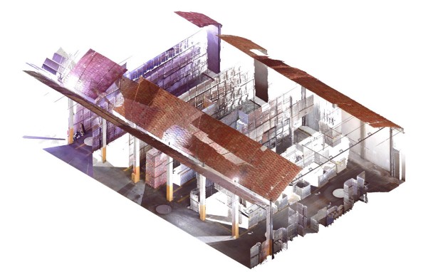 I lavori del caso studio trattato sono di particolare complessità strutturale con sostituzione delle volte previo consolidamento delle strutture con stabilimento in continua produzione, l’impresa ICG ha progettato e realizzato un sistema di montaggio della copertura all’intradosso di quella esistente. Alla complessità dei lavori si aggiunge quella operativa in quanto si deve operare in ambienti per produzione alimentare senza sospendere le attività di produzione stessa con un elevato e costante numero di interferente presenti come mostrato in figura a lato, ottenuta a seguito di rilievo 3d con tecnologia laser scanner.