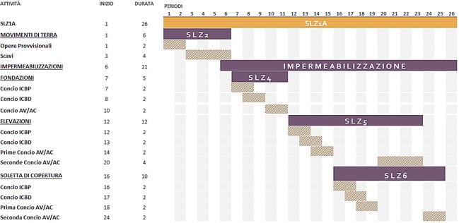 In this regard, the Gantt chart was created. For the application of this tool, the various activities were selected and entered and, by identifying the necessary resources and the sequence of the work phases, the optimal time schedule for the realization of the WBS SLZ1A was defined.