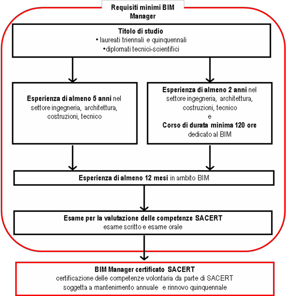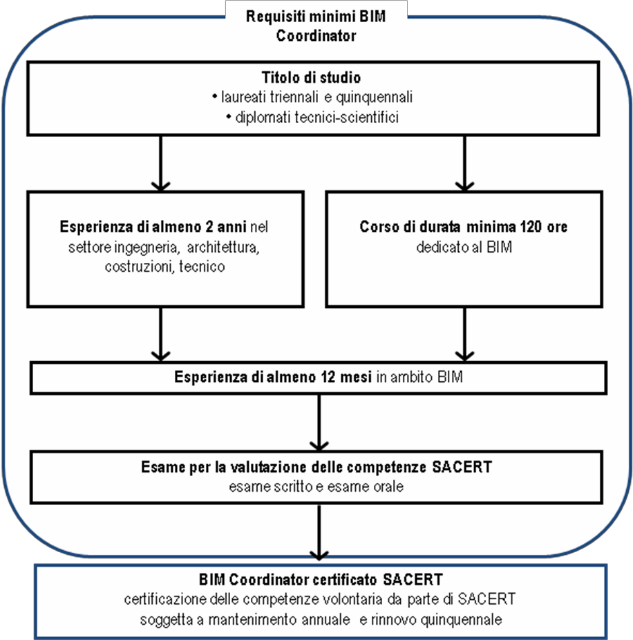 Essendo apparse alcune proposte su questa testata, viene qui riportata, a livello di schema riassuntivo dei requisiti minimi richiesti,  la proposta elaborata da SACERT (Associazione senza fini di lucro che opera nel settore della certificazione delle competenze in conformità con la UNI EN ISO 17024 per le figure del tecnico certificatore energetico e dell’esperto in gestione dell’energia), per la certificazione su base volontaria, della figura di “BIM Coordinator” e “BIM Manager”; si sottolinea che, in sintonia con quanto viene richiesto a livello internazionale e anche a livello nazionale per altri tipi di certificazioni, fra i requisiti minimi per il mantenimento e il rinnovo della competenza viene richiesta la frequenza a corsi specifici in ambito BIM. Come di seguito evidenziato, per l’ammissione all’esame di valutazione delle competenze, la frequenza di un percorso formativo specifico sul BIM riduce gli anni di esperienza professionale che un professionista deve dimostrare.
