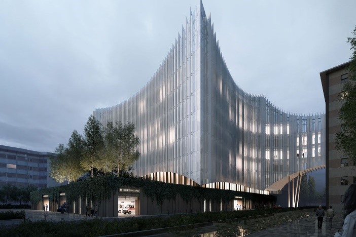 Architect Mario Cucinella’s project relates to a building of 40,000 square meters, with 8 levels above ground and 2 underground, inside which there are hospital wards of various sizes, ambulatories, First Aid, Intensive Care Ward, and numerous operating rooms.