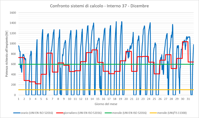 Since the software does not allow a direct comparison between steady‑state and dynamic loads, the hourly data were reprocessed using spreadsheets, obtaining daily and monthly averages comparable with the monthly results of the calculation according to UNI/TS 11300.