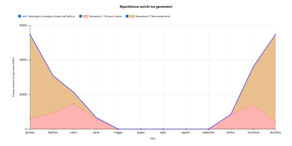 Figura 1: Thermal load sharing of the reference building between district heating and heat pumps by season.