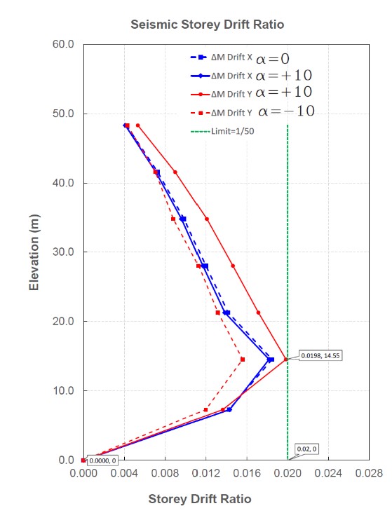 Le aree delle solette sono modellate come diaframmi elastici, utilizzando elementi a guscio per riflettere gli effetti di un’ampia apertura nelle colonne dei solai del pavimento e le travi sono modellate utilizzando elementi telaio. Gli effetti P-∆ sono inclusi nell’analisi. La massa sismica è stata calcolata come una combinazione di carico sovrapposto, una parte del carico dinamico e peso proprio generato dalla geometria del modello e dalle densità dei materiali. I carichi permanenti e permanenti sovrapposti vengono modellati utilizzando carichi su area, carichi lineari o carichi puntuali, a seconda dei casi. Il comportamento dinamico strutturale dell’edificio dell’auditorium è finemente sintonizzato per ottenere le prime due modalità come traslazionale, rispettivamente nelle direzioni trasversale, X e longitudinale, Y. Seguendo la Sezione 9.15 delle Basi di progettazione strutturale, le derive indotte dai terremoti sono state calcolate dal software di analisi agli elementi finiti ETBAS. Per i sistemi resistenti alla forza sismica comprendenti esclusivamente telai di momento in strutture assegnate alle categorie di progettazione sismica D, E o F, la deriva del piano di progetto (Δ) non deve superare Δa∕ρ per qualsiasi piano. ρ=1 e Da = 0,02 x altezza del piano secondo la Tabella 12.12-1 dell’ASCE 7-16. Il grafico mostra che il rapporto di deriva tra i piani della risposta anelastica massima è 1/54 in direzione X, che è inferiore al limite di 1/50.