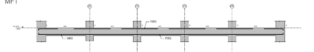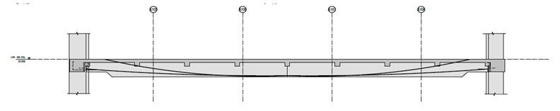 È stato eseguito un progetto preliminare della trave Moment Frame e della colonna Moment Frame. Le sezioni trasversali della trave del telaio del momento hanno una profondità di 850 mm e una larghezza di 900 mm. I momenti sismici e gravitazionali sono presi direttamente dall’output del programma ETABS in seguito all’effetto del carico sismico definito nella Sezione 9.12 e alle Combinazioni di carico 9.18.4 della Base di Design. Il processo di progettazione per la determinazione dell’armatura longitudinale è illustrato nell’estratto del foglio di calcolo nella relazione principale e si basa sull’ACI 318-19M. Nell’esecuzione dei calcoli di progetto, per le travi vengono utilizzate tre diverse resistenze a flessione. I livelli sopra l’auditorium sono destinati ad essere aree di formazione. Secondo le indicazioni dei Clienti, è richiesta la massima flessibilità, che implica spazi liberi per le colonne, per raggiungere l’intento architettonico sono selezionate travi PT profonde 1,2 m. Un’analisi preliminare viene effettuata utilizzando il software ADAPT PTRC-2018.