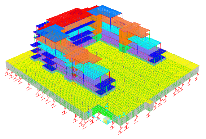 Nella modellazione numerica di edifici per i quali è necessario eseguire un’analisi sismica al fine di definire il più idoneo intervento strutturale atto a migliorare la risposta sismica (sia in termini di miglioramento o di adeguamento), gli elementi finiti del modello sono normalmente incastrati alla base. Al fine di ottimizzare l’intervento, ma anche per meglio comprendere una più veritiera risposta sismica, è opportuno considerare l’interazione dinamica tra la struttura in elevazione, la fondazione ed il suolo. E’ il caso di un edificio esistente di 5 piani fuori terra, realizzato in calcestruzzo armato con sistema resistente alle azioni orizzontali costituito da quattro nuclei di controvento.