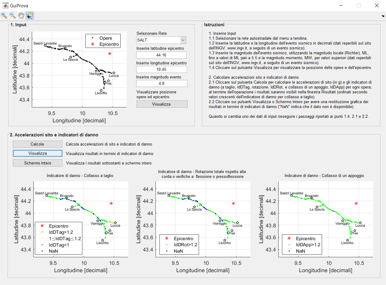 Nel caso in titolo, tramite l’ausilio del software Matlab, è stato sviluppato un applicativo che, a partire dalla conoscenza di pochi input (tra l’altro di facile reperibilità) è in grado di effettuare una stima dello stato complessivo della rete e di fornire informazioni dettagliate sulle opere che la costituiscono, in particolare: tipo ed entità dei danni che probabilmente hanno subito.